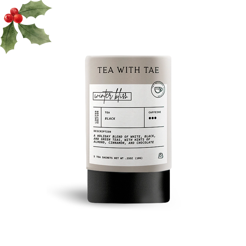 Tea with Tae's most enchanting blend, comprised of three different types of premium whole-leaf teas -- Pai Mu Tan white tea, Ceylon black tea, and Chinese green tea -- blended together with real bits of toasty almonds and coconuts, cinnamon chips, chocolate, and hazelnuts.
