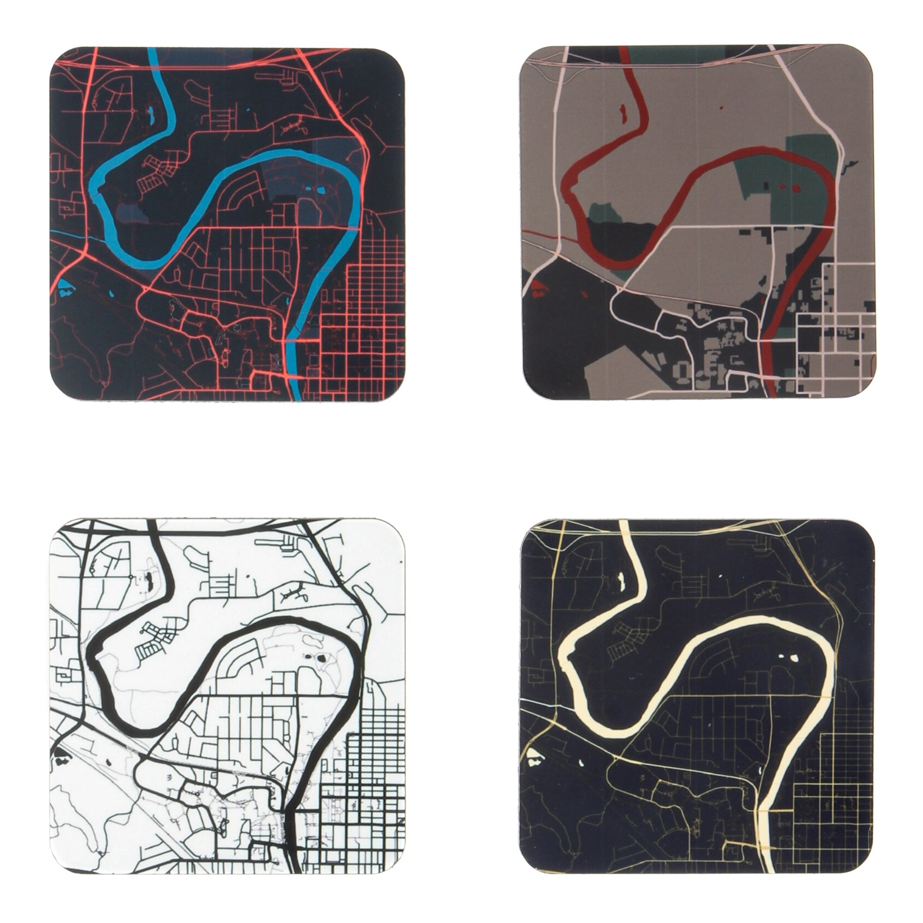 These abstracted Iowa City map coasters are exclusively made for AKAR Design by Architect Sanjay Jani