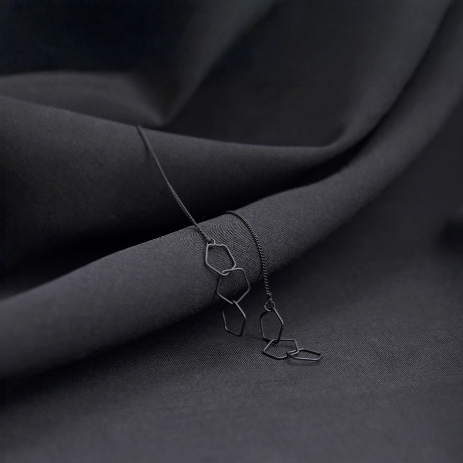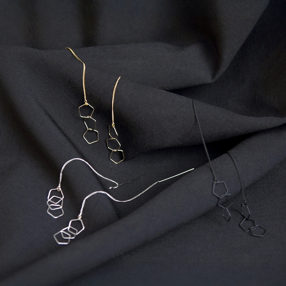 Elevate your style with the mesmerizing Allegra ear drapes. Crafted with interlocking honeycomb-shaped components, these delicate accessories gently sway back and forth, creating a captivating geometric display. With dainty ear threaders, they seamlessly integrate with your look, adding a touch of modern elegance.