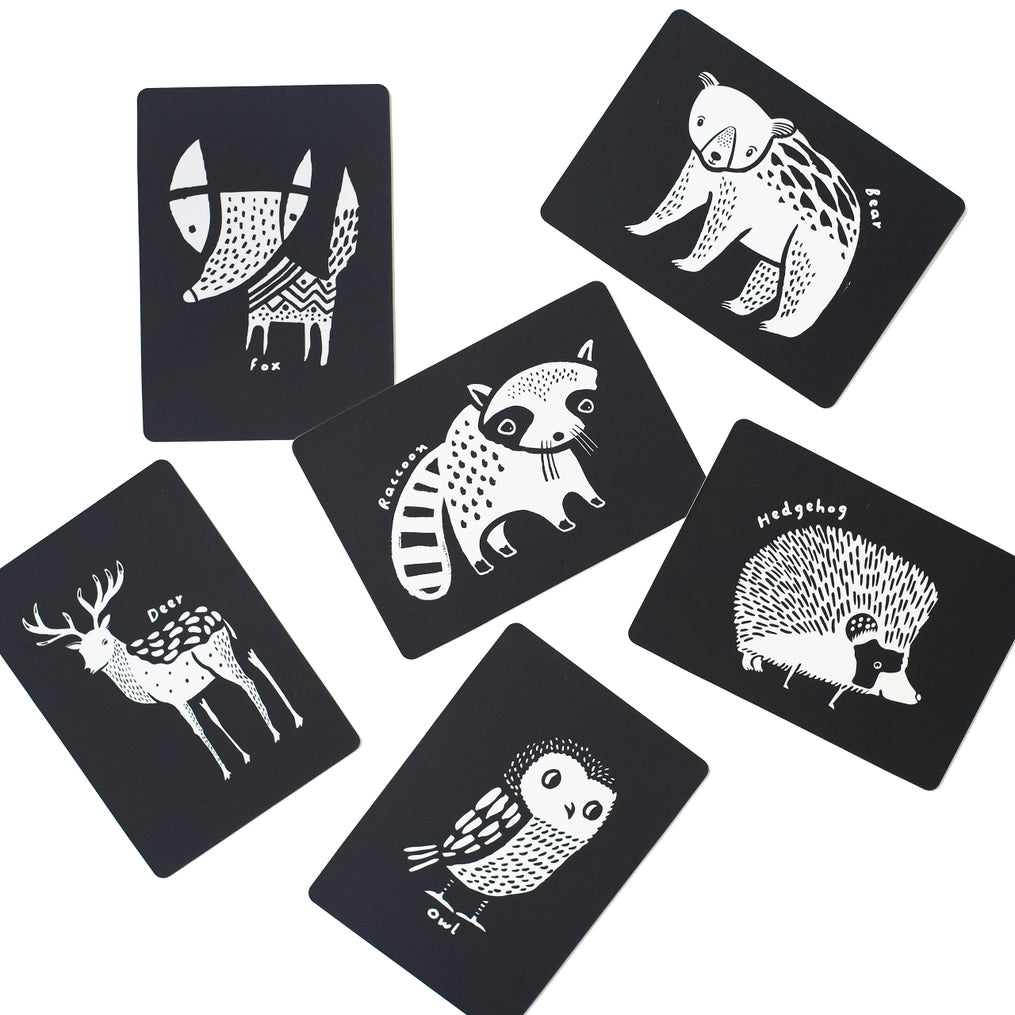 Babies are captivated by black-and-white patterns. Right off the bat, these art cards help nurture a baby's visual perception. This set features six charming animals - a fox, hedgehog, raccoon, deer, owl, and bear - all measuring 5"x7" inches. Printed with eco-friendly ink on durable cardboard with rounded edges, these cards are the ultimate introduction to art and design.