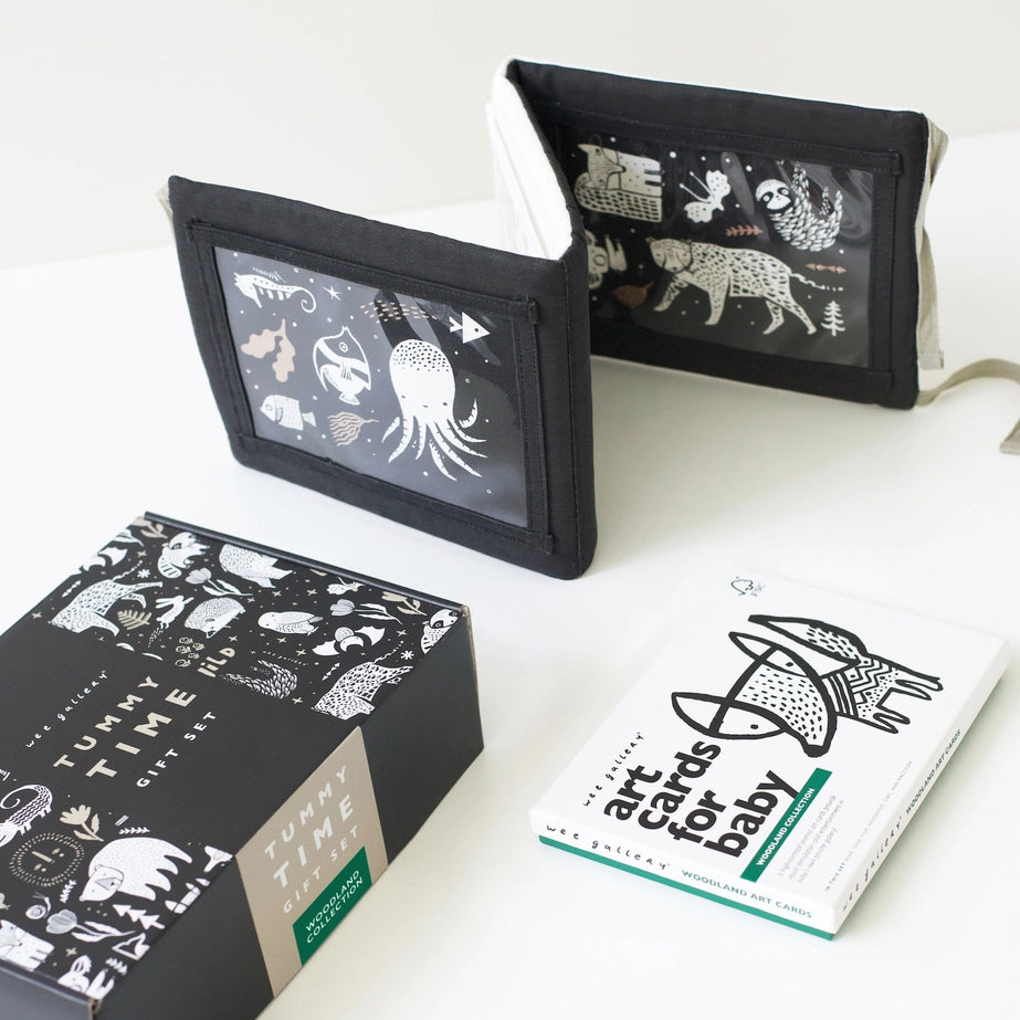 The Tummy Time Gallery and Art Cards Gift Set pairs together our Tummy Time Gallery and your choice of Art Cards for Baby — all in a beautiful custom gift box! The reversible Tummy Time Gallery space has many opportunities for stimulation. Illustrated graphics, embroidered features, and pockets for the included Wee Gallery 5x7 inch Art Cards.