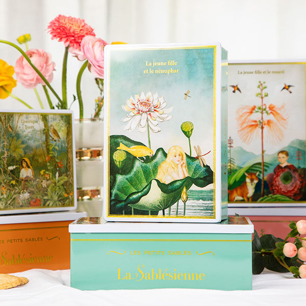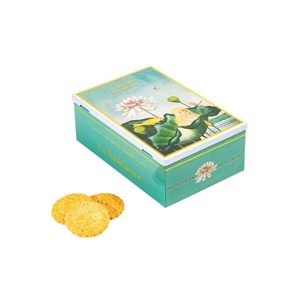 Delicious shortbread with salted butter caramel and lemon nuggets, in a magnificent metal box with a watercolor decoration depicting a young girl and a water lily in a dreamy landscape. For lovers of good and beautiful things. These shortbread cookies are made by our patissiers at La Sablésienne, an artisanal cookie factory in the Pays de la Loire region of France. Sables-style shortbread cookies made according to traditional recipes originating in Sables, France.