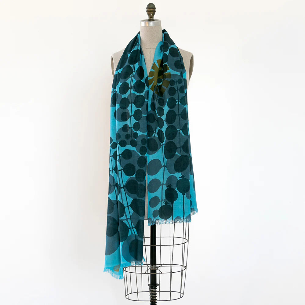 Echo Escape is a rhythmic jazzy design inspired by an unknown leafy plant in my garden with long thorns on the stems and beautifully spaced rounded foliage. Melodic leaves and blooms on a heavenly soft merino.