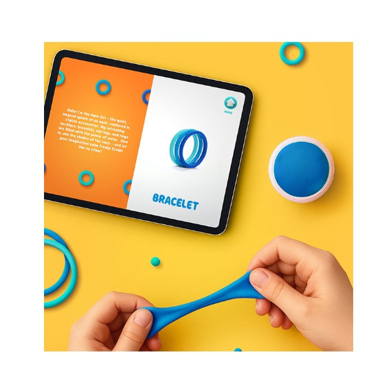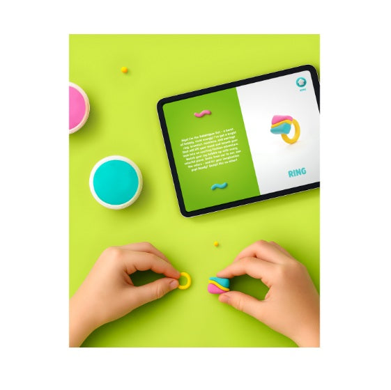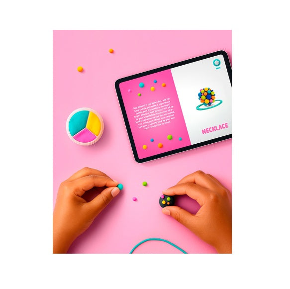 Then, grab the 8 cans of clay, the ring sizer, the ring cone, the sculpting tool, and the three strings to start sculpting the perfect pop of joy to go with any outfit and any occasion. High-quality clay and interactive app for molding creative fashion accessories