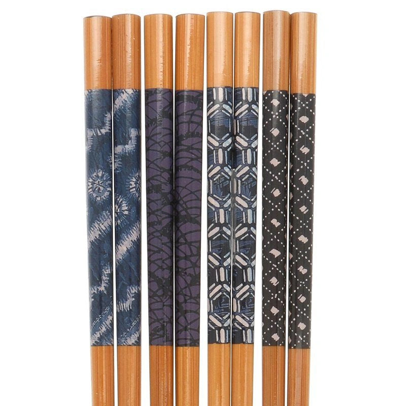 Chopsticks lacquered bamboo with assorted indigo design.