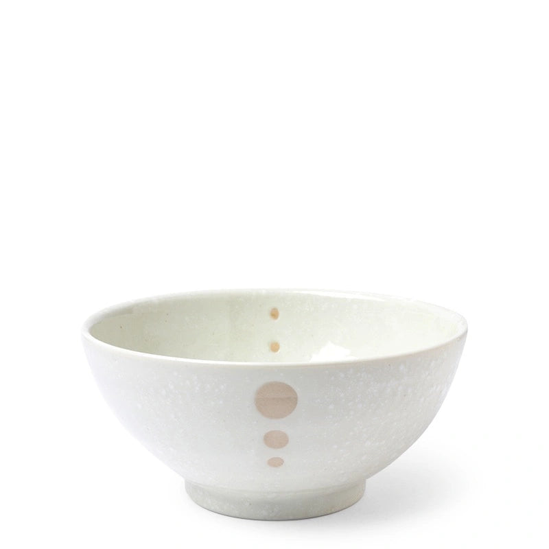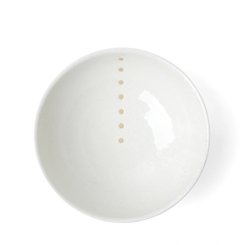 White glazed bowls with beige circle design.