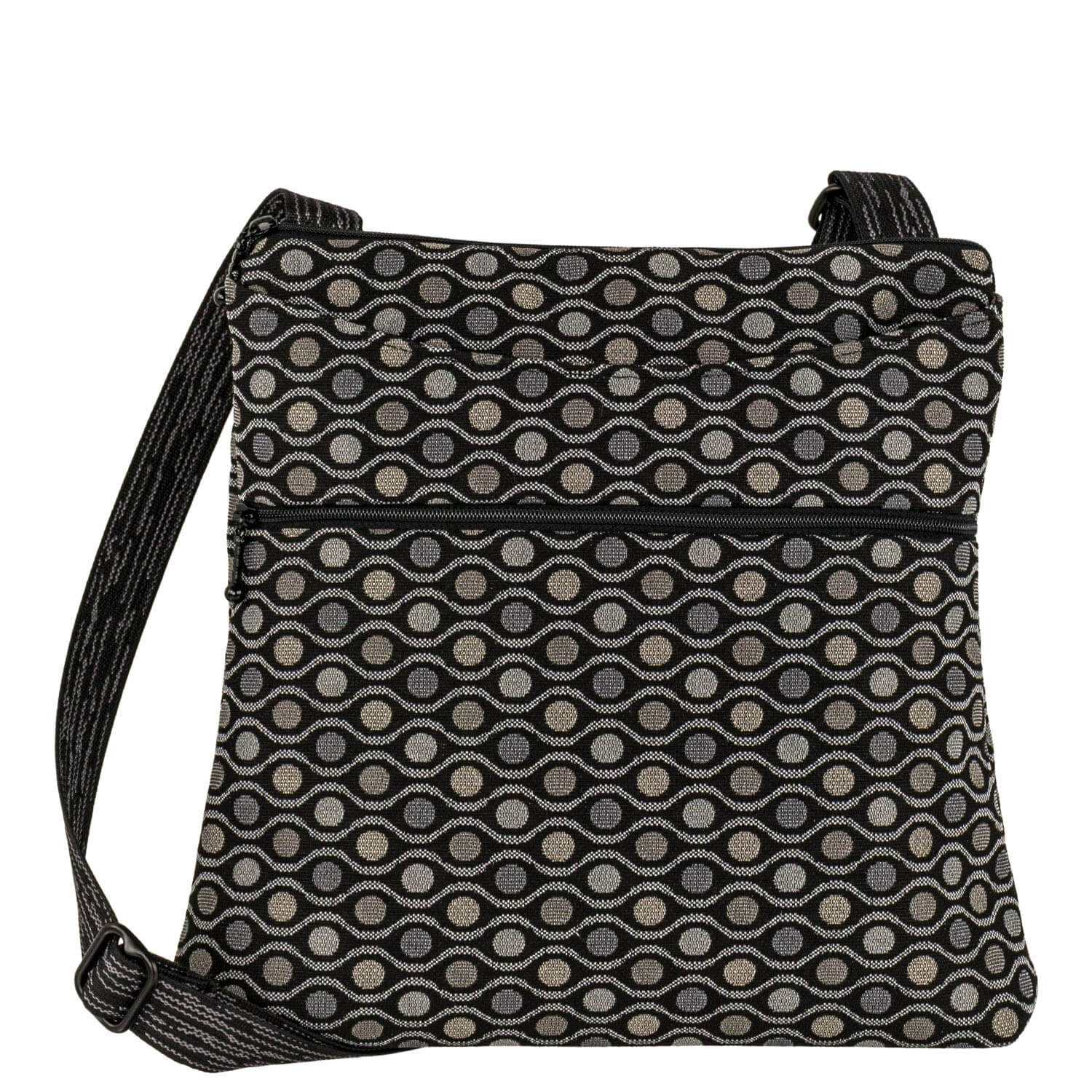 A top favorite! Main compartment has a top zipper, spacious interior, and small open pocket. Two exterior pockets - one open (6.5 inches deep) for fast access and one zipped. A generous pocket on the back holds a water bottle. This bag is fantastic!