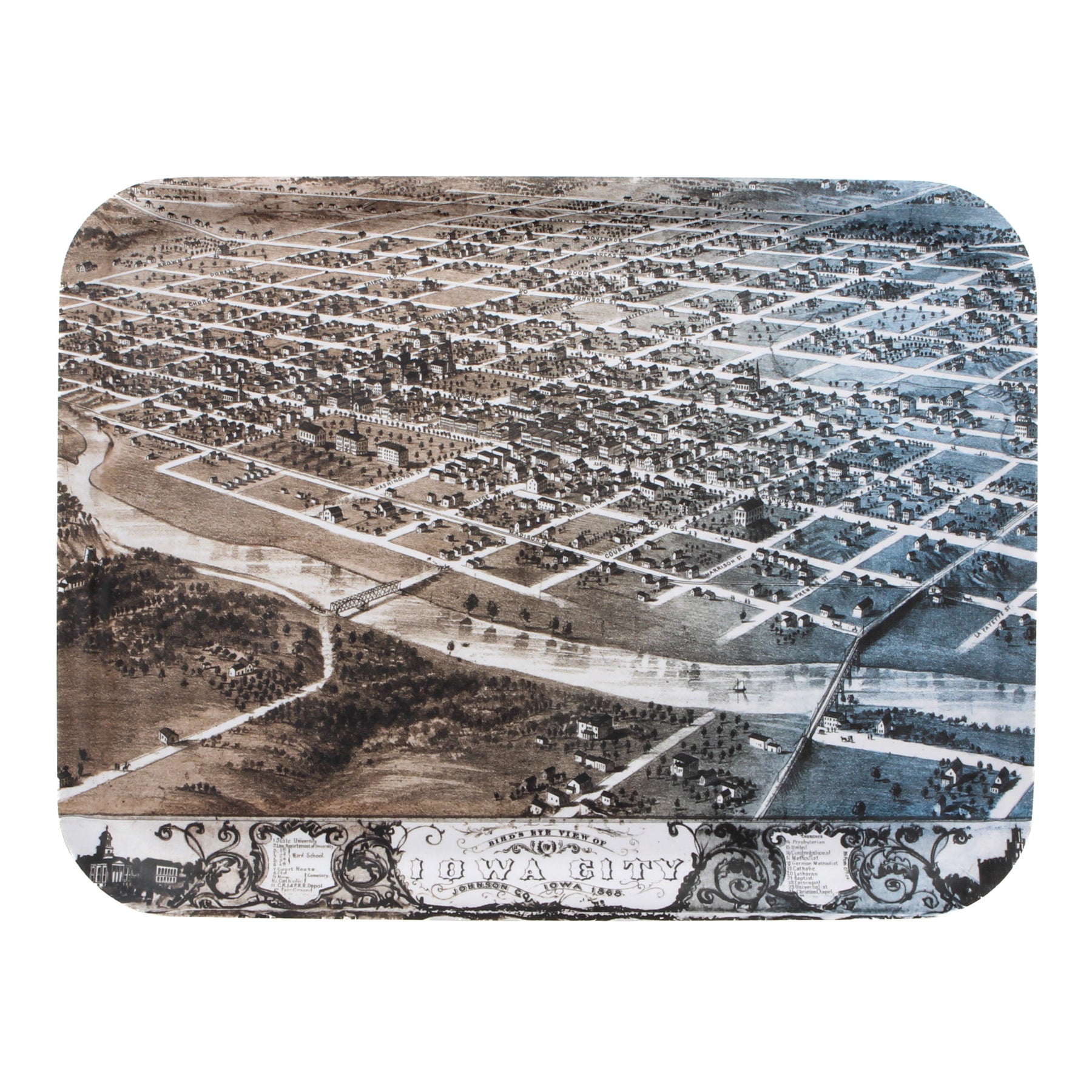 These trays are exclusively designed for AKAR Design by Architect Sanjay Jani. This map is a birds eye view of Iowa City from 1868!