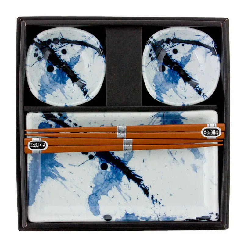 Blue glazes artistically splattered on this Blue Sumi Collection creates a beautiful pattern that you will love even on the bluest days. Blue Sumi Sushi Set includes two 8.75" x 5" rectangular plates, two sauce dishes and two pairs of chopsticks so you can share some sushi with your honey. Also makes a nice candle/soap dish set. Packaged in a gift box making it perfect as a housewarming, hostess or wedding gift.