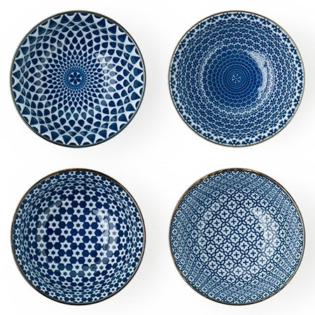 Blue and white is the new neutral. These 5" bowls are perfect for cereal, rice, soup, dessert, noodles, salad and snacks. Assorted patterns to bring beautiful variety to your life. This Japanese bowl set includes four bowls packaged in a black gift box.