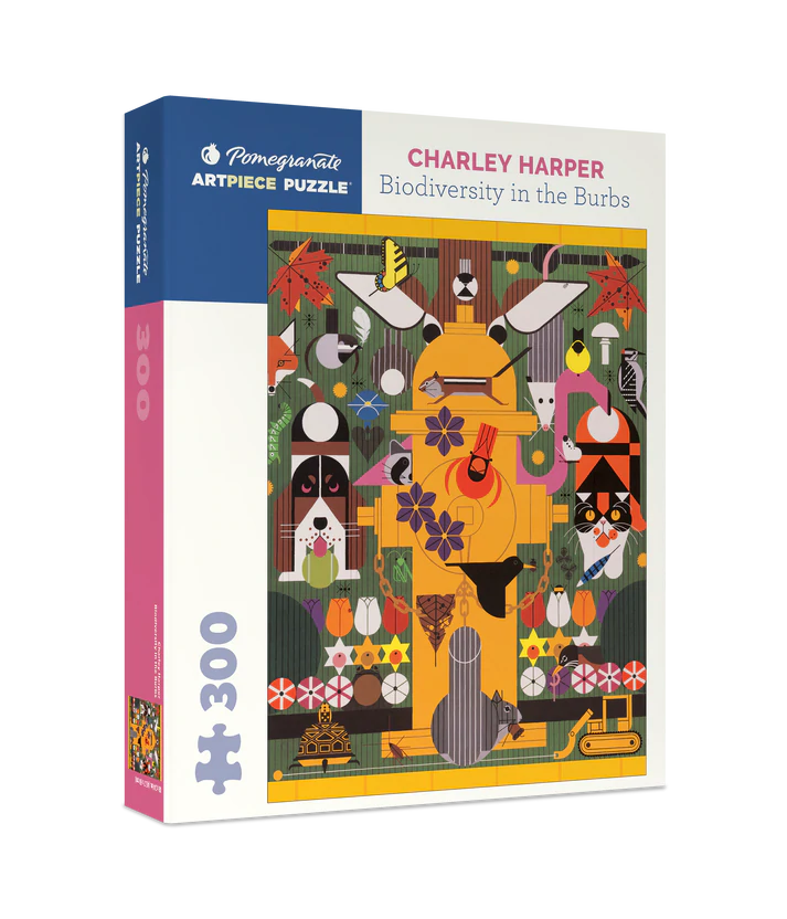 Charley Harper (American, 1922–2007) Biodiversity in the Burbs Charley Harper loved animals, and both wild and domestic varieties can show up in suburbs, the subject of this delightful painting. You might not see the snake or the frog at first glance, or the raccoon peeking at you. But put this 300-piece puzzle together, and all will be revealed.