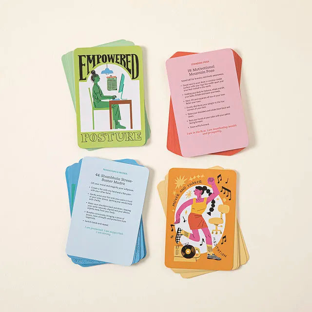 Work and life have changed, so it's time to change how we care for our bodies during work hours. The practical and beautiful deck offers 52 practices that can be done anytime, anywhere. Whether you need a stretch break or a mental reset, whether you have 10 minutes during lunch or only 2 minutes between calls, there is something for everyone—no mat required.