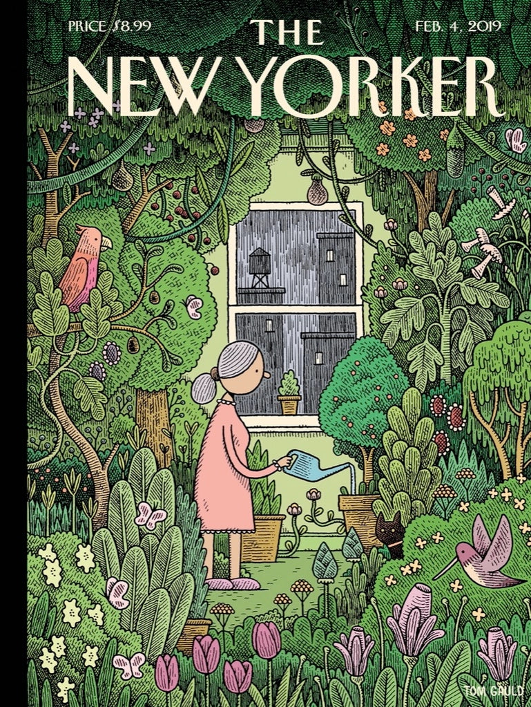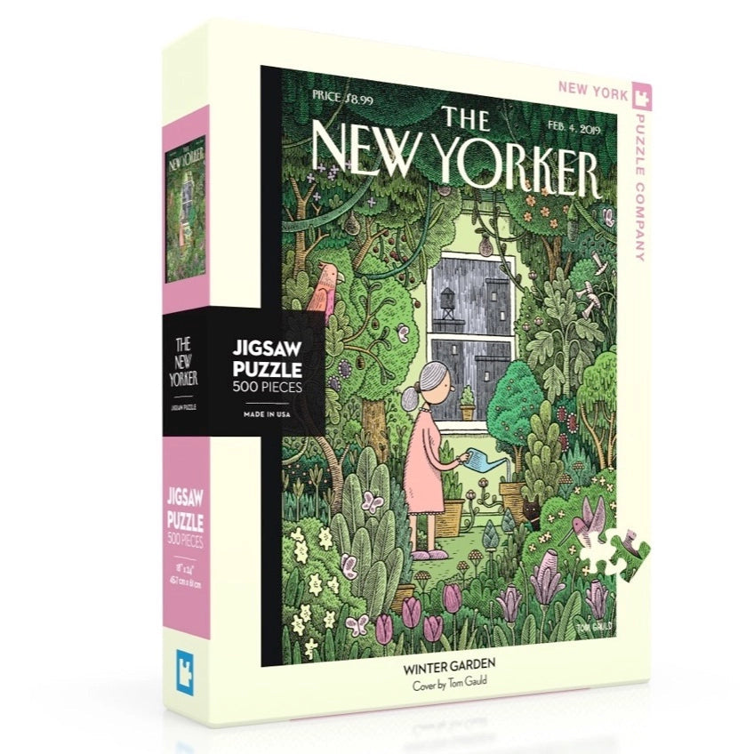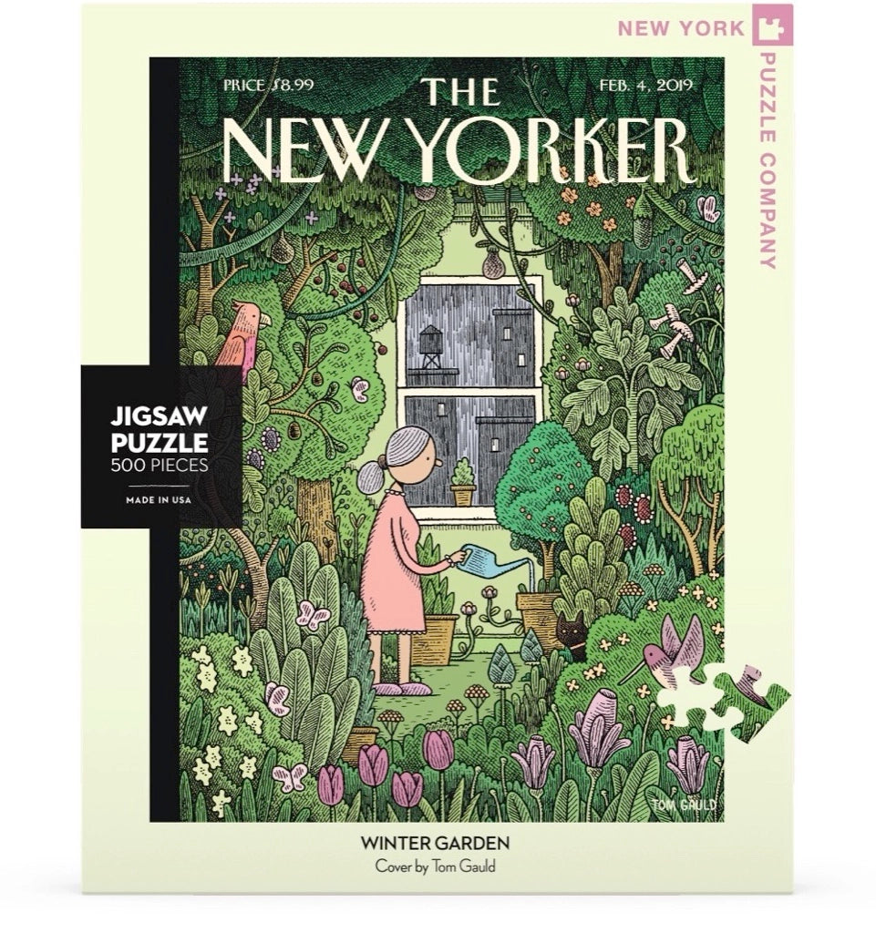 Step into a serene and cozy world with Winter Garden, a 500 piece jigsaw puzzle featuring the captivating 2019 New Yorker magazine cover art by Tom Gauld. This enchanting scene showcases a woman tending to her indoor oasis, surrounded by a lush array of vibrant greenery as rain gently pours outside the windows. The contrast between the peaceful indoor garden and the moody weather creates a calming and immersive puzzle experience. With intricate details and soft, soothing colors, Winter Garden invites puzzle lovers and art enthusiasts alike to escape into a tranquil, green-filled sanctuary. Perfect for cozy afternoons or relaxing evenings, this puzzle celebrates the beauty of nature indoors and the peaceful moments of solitude.