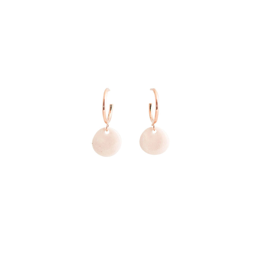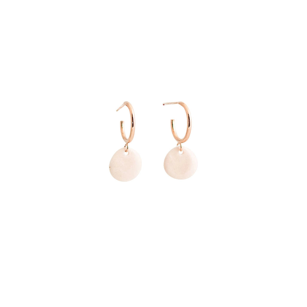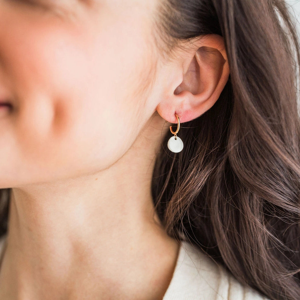 An elevated huggie hoop version of Jenna Vanden Brink's best selling Mini Moon Drops. Hand-formed porcelain pieces hang loose from high quality hoops.