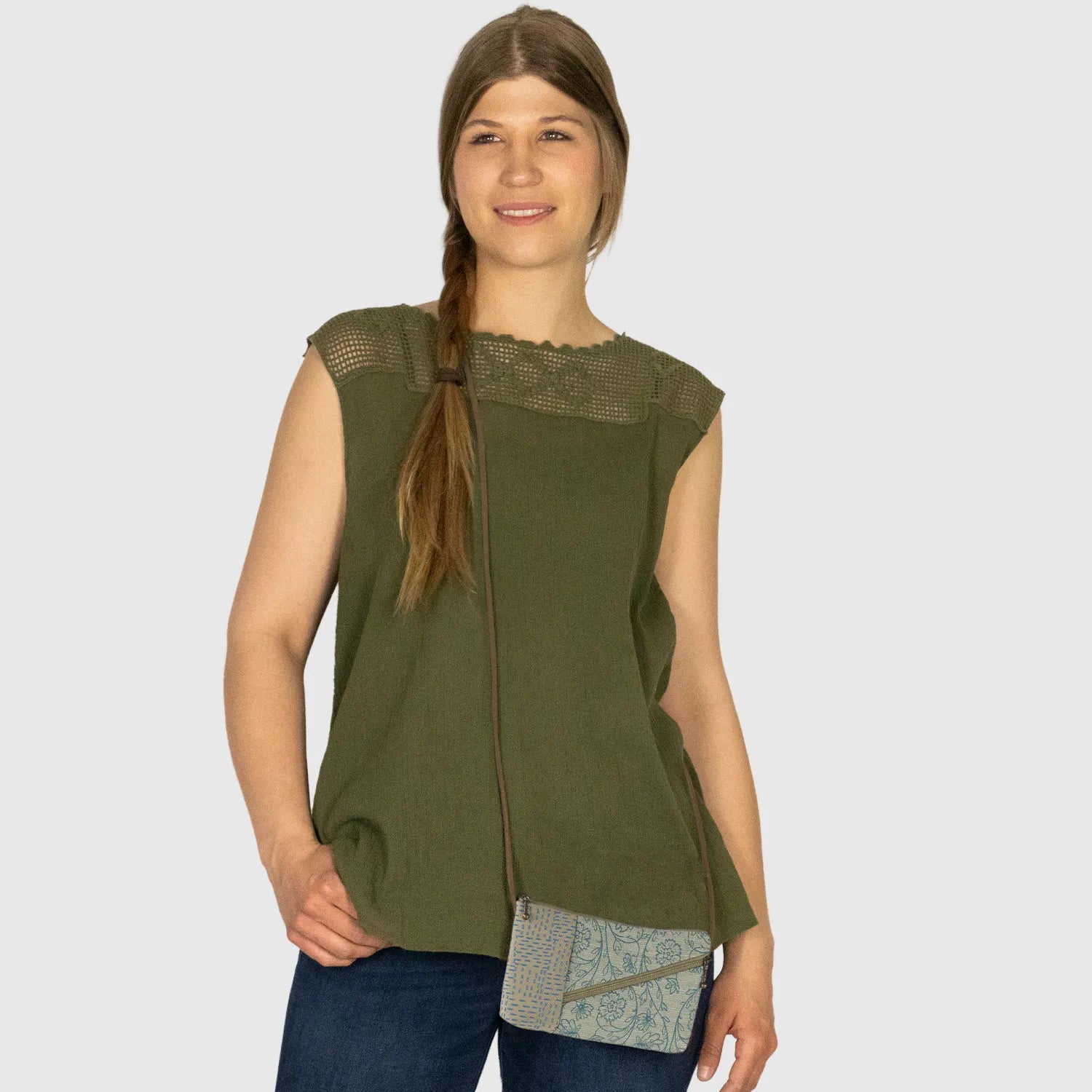 This bag features a sling that serves as a wallet! Perfect for those who prefer a horizontal design. It boasts a roomy main compartment with a zipper, suitable for most iPhones, and two outside pockets. The grey liner inside is water-resistant and easy to wipe clean.