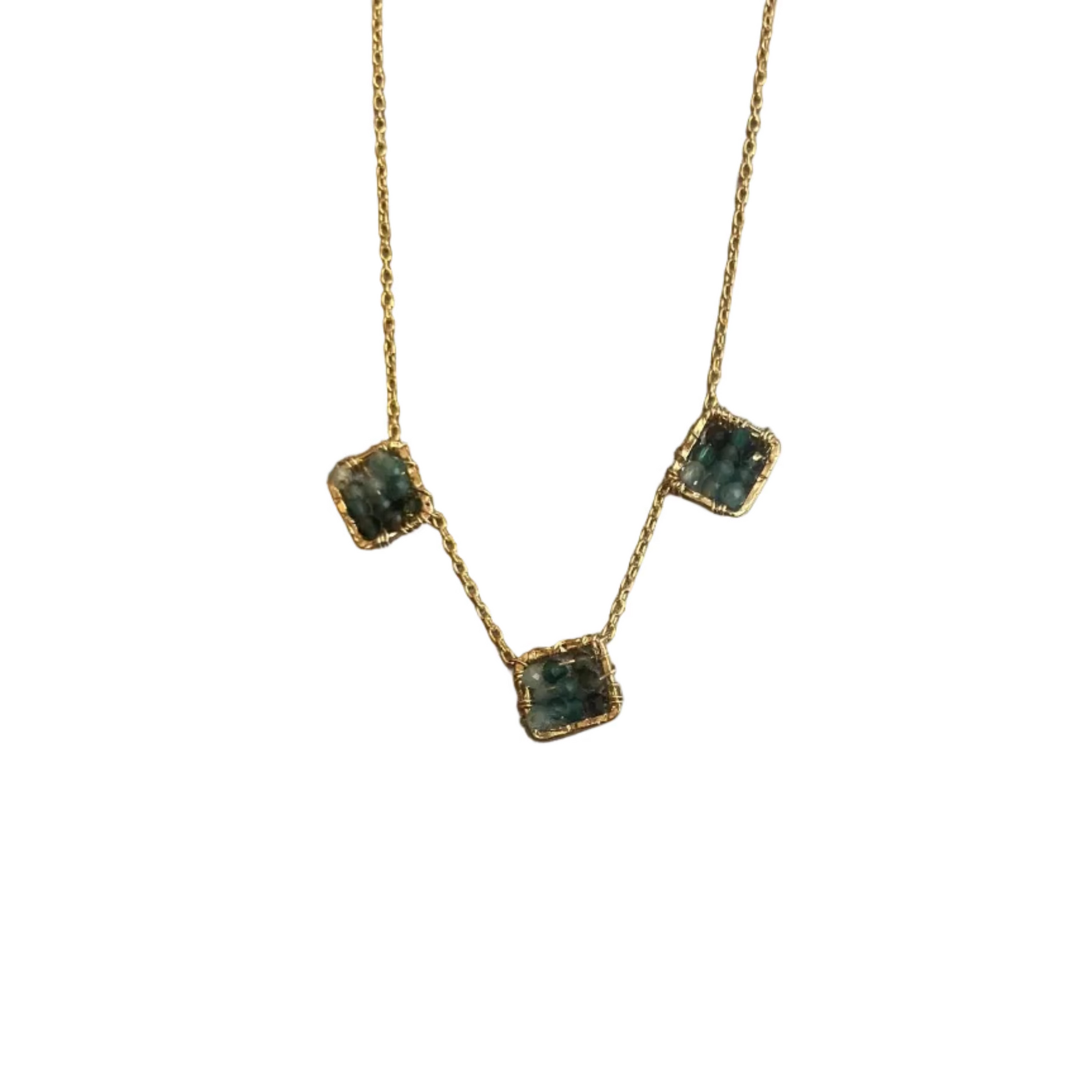 Shaded blue to green Grandidierite beards are wire threaded three mini boxes, all with flexible "hinges" between for movement. 17” on delicate gold-filled cable chain, lobster clasp.