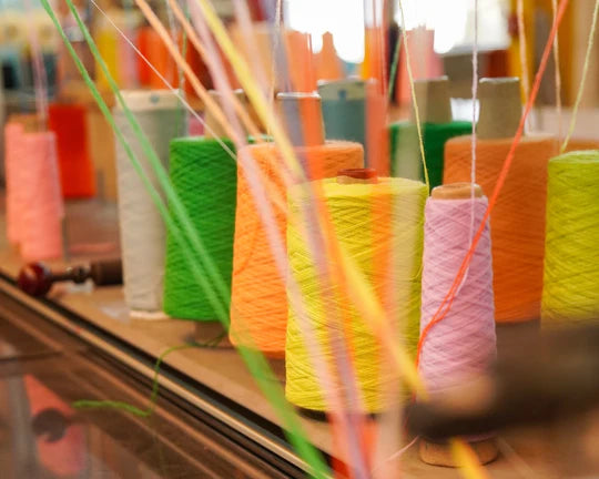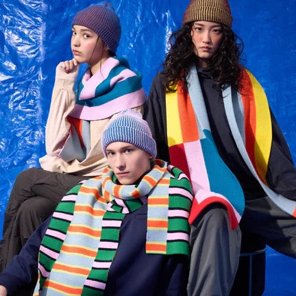 Our debut collection gave purpose to a rainbow of unused remnants. We transformed surplus material into brightly patterned knit accessories. This sustainable spirit, using unconventional materials and industrial techniques, continues today."