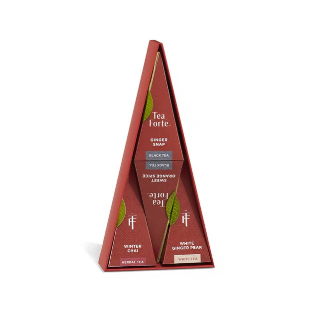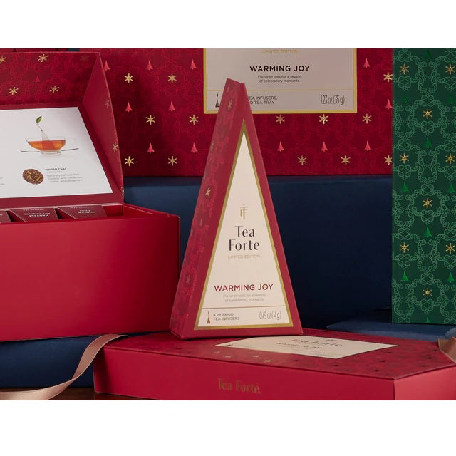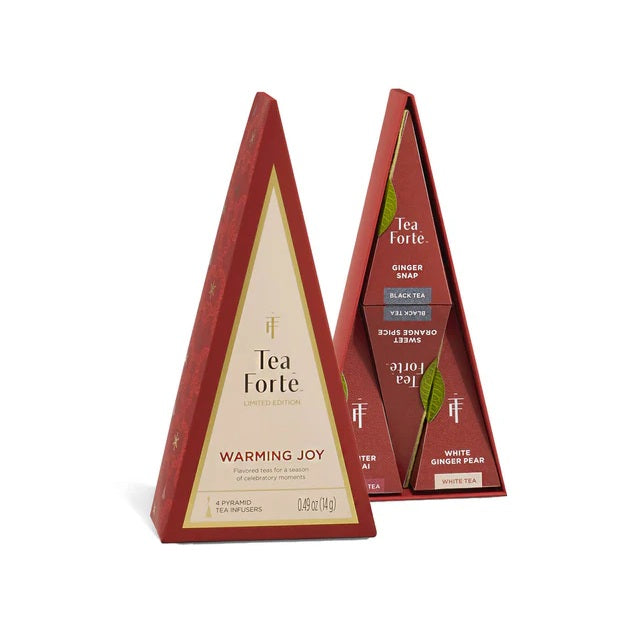 Add a little holiday cheer to everyone’s stocking with Petite Tea Trees. It's a perfect thank-you gift for friends, family, and everyone on your "good" list! They also make a great place-setting gift for guests at your next dinner party. Each limited-edition, tree-shaped box contains four Warming Joy pyramid tea infusers; the new Ginger Snap, Sweet Orange Spice, White Ginger Pear and Winter Chai.