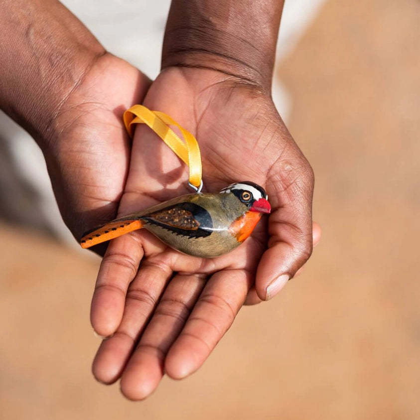 Carved out of a fallen jacaranda tree branch this charming bird ornament can be hung from its satin ribbon on a doorway, in a window or Christmas tree, or use it to decorate your bag.