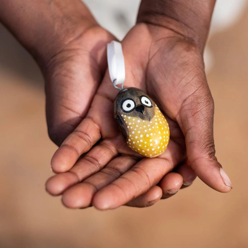Carved out of a fallen jacaranda tree branch this charming owl ornament can be hung from its satin ribbon on a doorway, in a window or Christmas tree, or use it to decorate your bag.