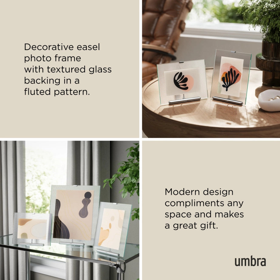 With its decorative easel design, this frame effortlessly showcases your cherished memories. Its versatile design accommodates both 4x6 or 5x7 photos, while the ribbed glass texture adds an elegant touch. Plus, enjoy the freedom to display your photos in either landscape or portrait orientation. Capture and display your favorite moments with flair using the Umbra Flute Picture Frame.