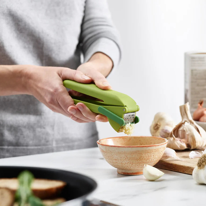 This powerful garlic press crushes cloves with ease and features a wiper blade and a handy scraping tool for easy cleaning.