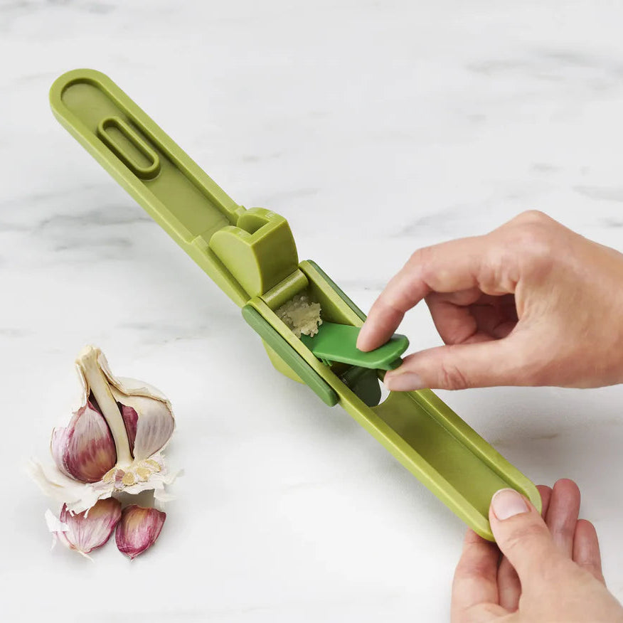 - Handy cleaning tool for removing trapped garlic and skin from crushing plate