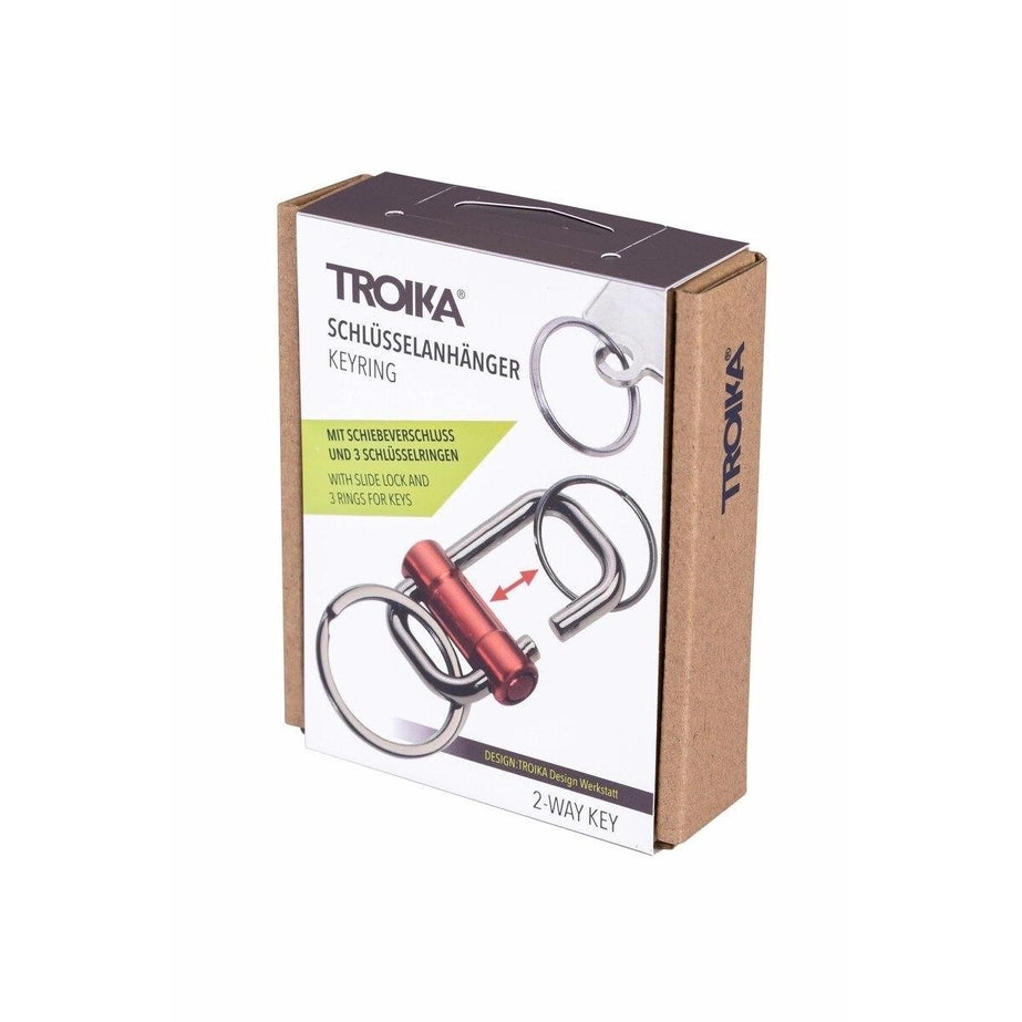 Two-Way Quick Release Keychain with Three Split Rings Troika has created a quick release keychain with three split ring keyrings. A cool technology for all those who are frequently switching between keys. Simply release the lock at the push of a button, and the metal bolt will glide smoothly to the left or right and release the key rings. Made of solid cast metal in gunmetal grey, with a red clasp.