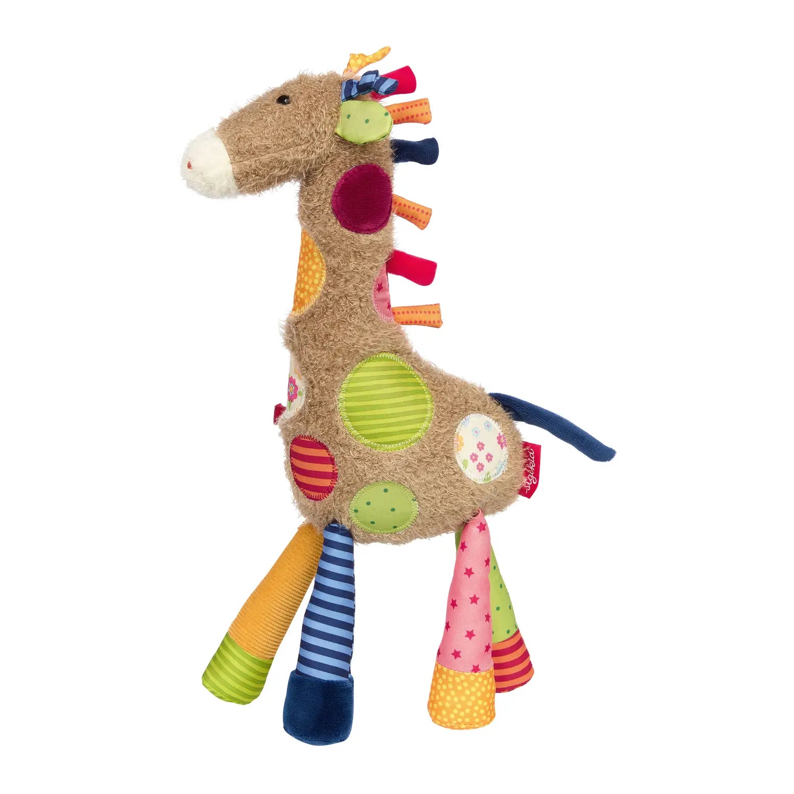 Made from a wide range of patterned patches in bright green yellow, red, purple and blue, she becomes an instant favorite and indispensable cuddle and learning toy. Grab yourself some giraffe magic today!