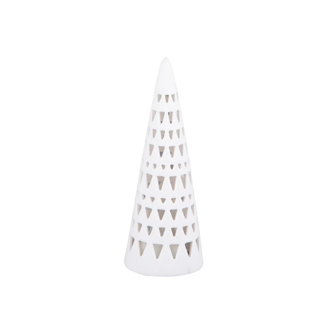 Fir Trees are the perfect accessory to your village. A forest of snow white porcelain with perforated patterns magically brings light to the dark night. The simply shaped fir trees with beautiful cutouts create points of light on the table, wall and ceiling. Battery operated LED module uses LR44 button batteries (included).