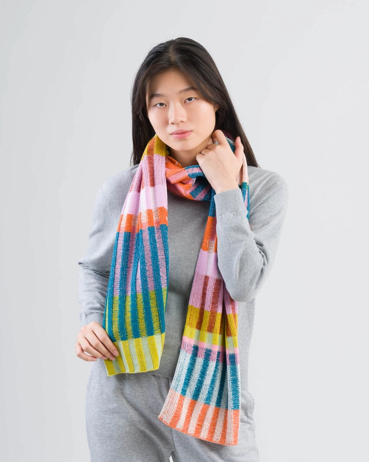 Our debut collection gave purpose to a rainbow of unused remnants. We transformed surplus material into brightly patterned knit accessories. This sustainable spirit, using unconventional materials and industrial techniques, continues today."