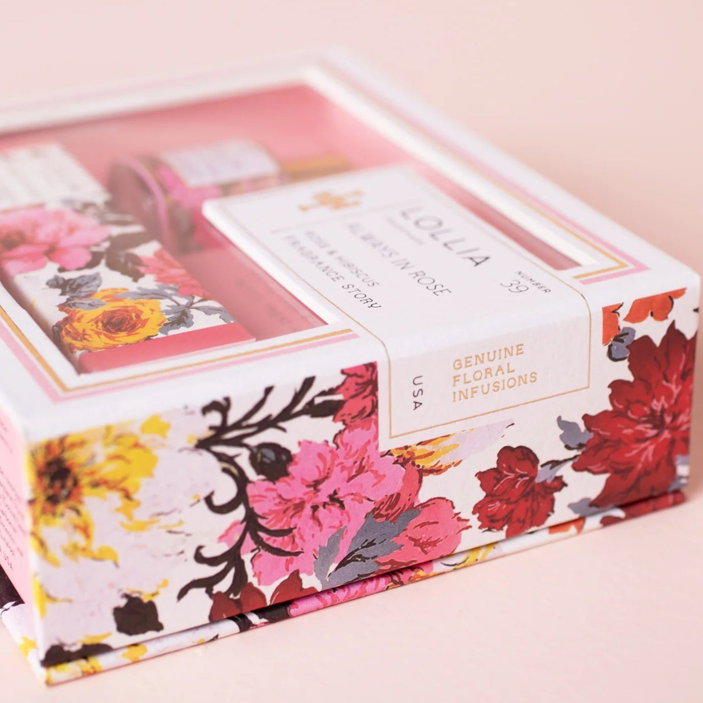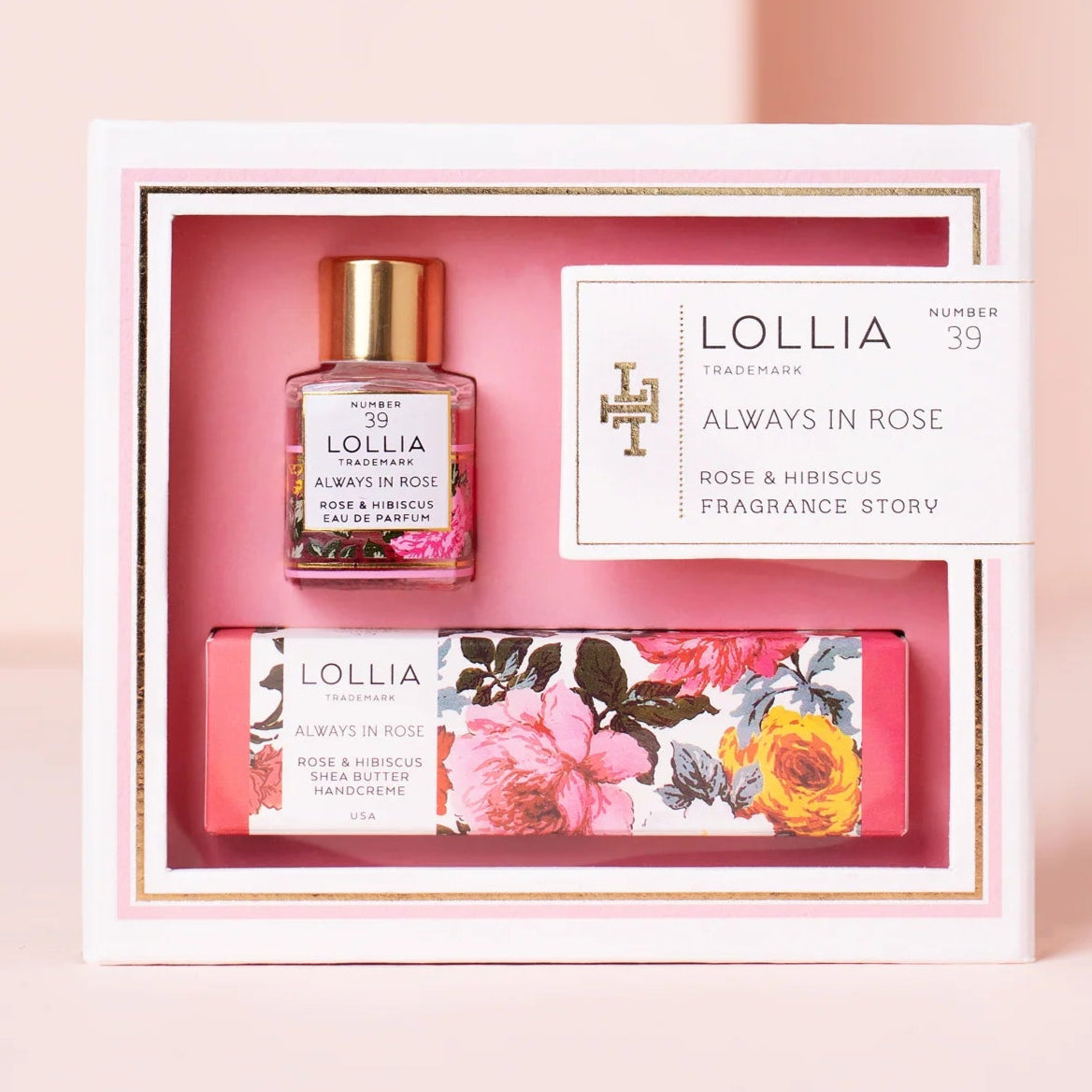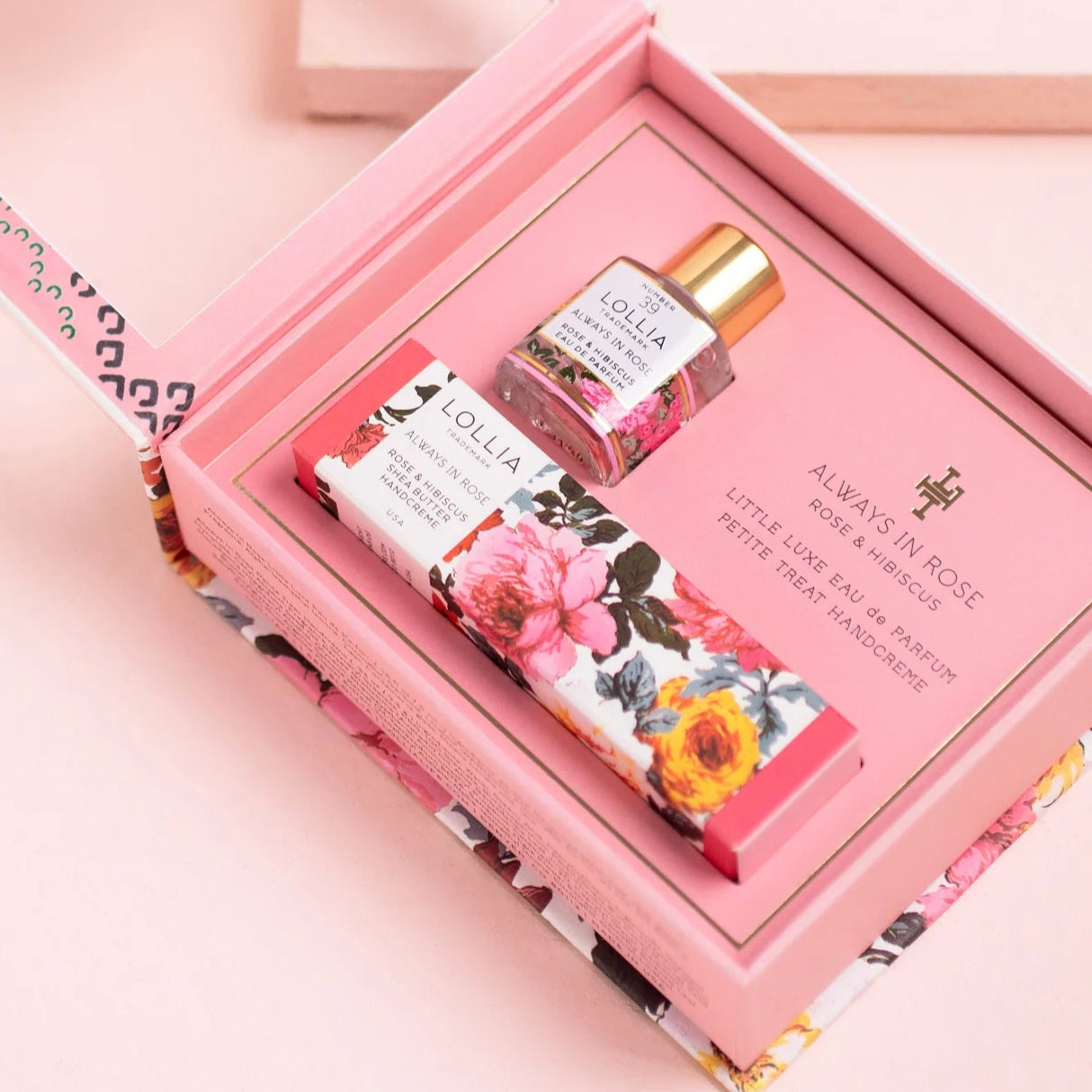Delve into a captivating fragrance story. This chic petite pairing of Eau de Parfum and Shea Butter Handcreme is the perfect introduction to the alluring Always in Rose fragrance, for yourself or as a gift. A decadent duo, enjoy silky-smooth, delightfully-scented skin. A sublime set for on-the-go luxury.