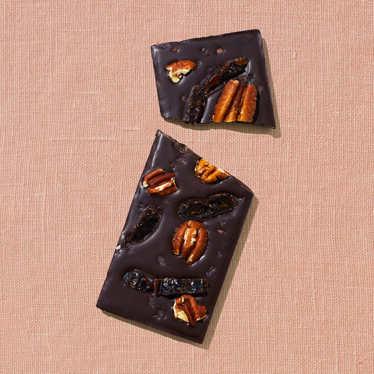 Crunchy, chewy, salty, and sweet, this bar brings together buttery, slow-roasted pecans and caramelly Medjool dates on a bed of date-sweetened dark chocolate, for a toothsome mix that’s hard to stop munching. No added sugar.