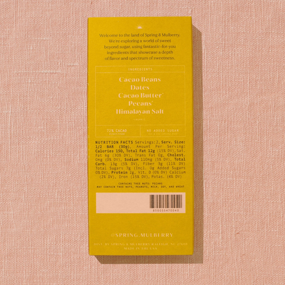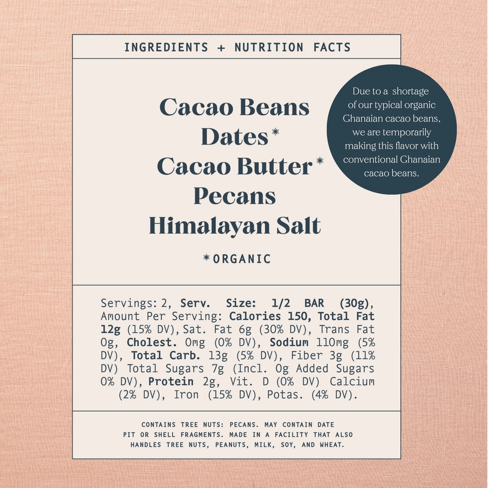 - Ingredients: Organic Cacao Beans, Organic Dates, Organic Cacao Butter, Organic Pecans, Himalayan Salt