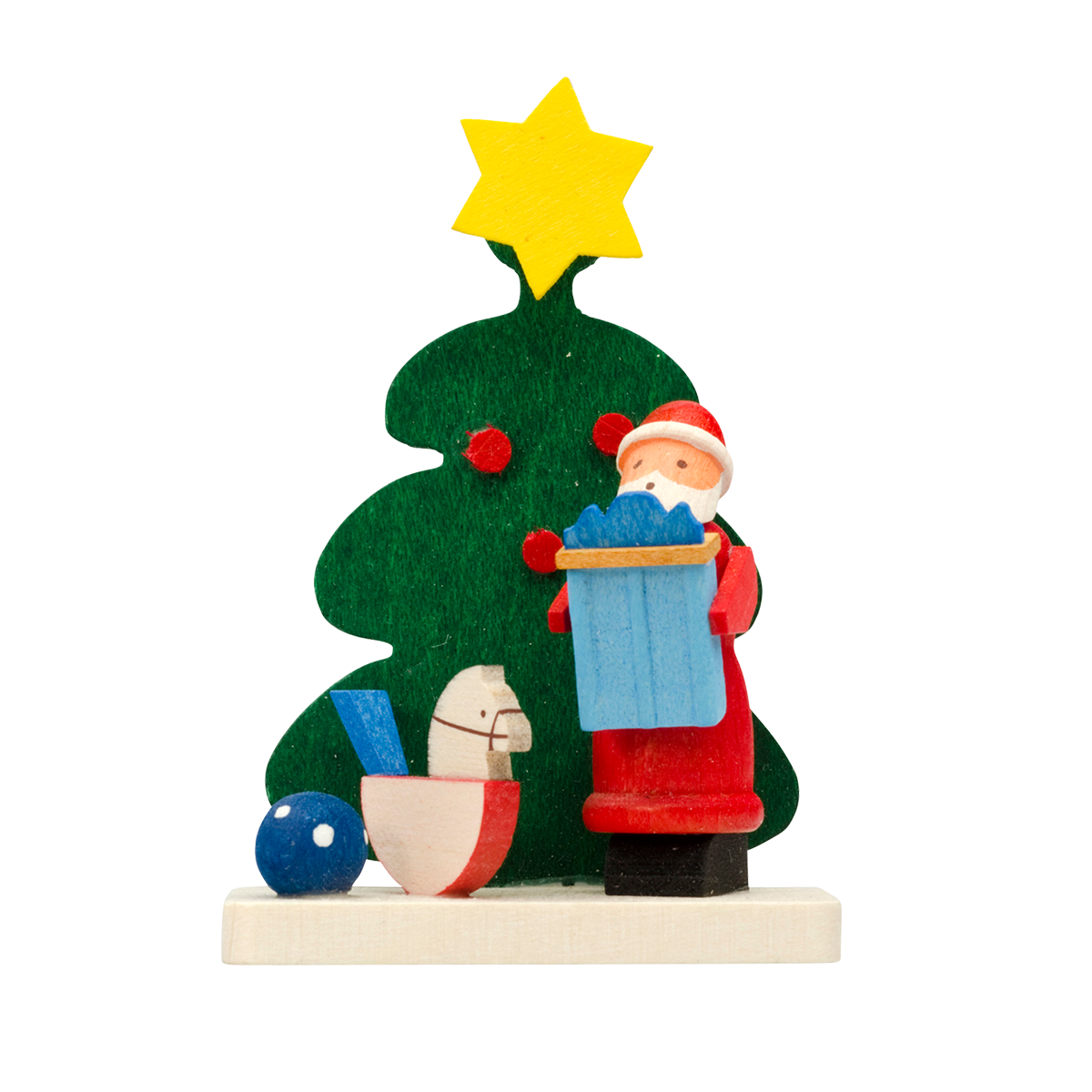 The two classics of the festival combined in a detailed Christmas tree decoration - the hand-painted Santa Claus as a miniature figure in a red coat in front of the decorated Christmas tree. Hang on your tree or adorn a gift.