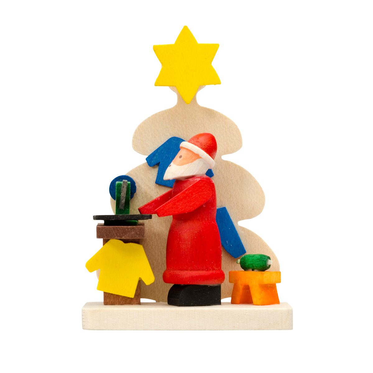The two classics of the festival combined in a detailed Christmas tree decoration - the hand-painted Santa Claus as a miniature figure in a red coat in front of the decorated Christmas tree. Hang on your tree or adorn a gift.