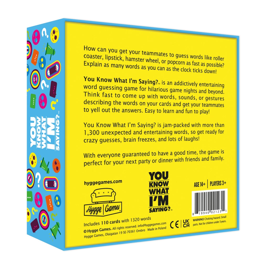 How can you get your teammates to guess words like roller coaster, lipstick, hamster wheel, or popcorn as fast as possible? Explain as many words as you can as the clock ticks down! You Know What I’m Saying? is an addictively entertaining word guessing game for hilarious game nights and beyond. Think fast to come up with words, sounds, or gestures describing the words on your cards and get your teammates to yell out the answers. Easy to learn and fun to play! You Know What I’m Saying? is jam-packed with more than 1,100 unexpected and entertaining words, so get ready for crazy guesses, brain freezes, and lots of laughs! With everyone guaranteed to have a good time, the game is perfect for your next party or dinner with friends and family.