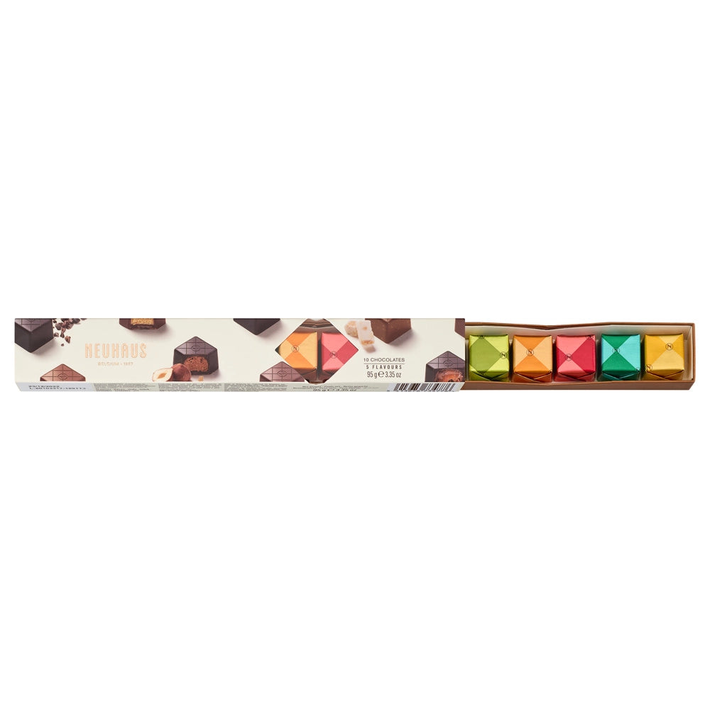 The Bonbon 10 pcs Box (95 g) contains individually wrapped Neuhaus chocolate Bonbons made from unique ingredients. Treat yourself during a long drive, a picnic in the park, or dream away at your desk for a minute. Just make sure you always have some of our Bonbons at hand: rich chocolate pralines in bite-size, with tempting flavors like Salted Caramel or Crunchy Nuts.