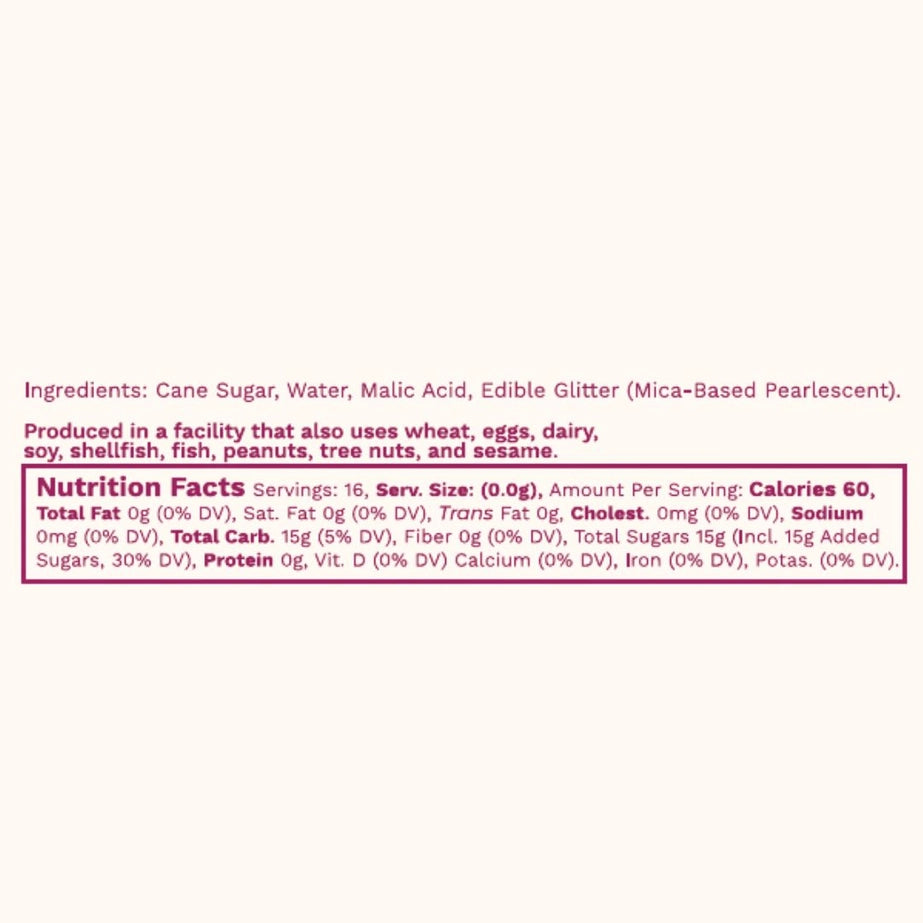 • Ingredients: Cane Sugar, Water, Edible Glitter, Malic Acid