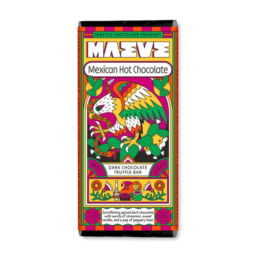 Scintillating spiced dark chocolate with swirls of cinnamon, sweet vanilla, and a pop of peppery heat.